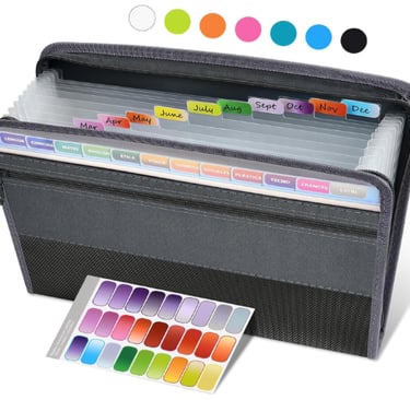 A practical, everyday accordion file organizer designed for staying on top of bills, tax documents, and receipts. With 12 expandable pockets
